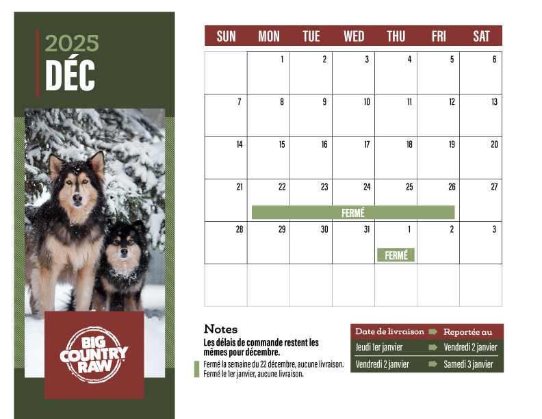 Notre calendrier de livraison de Noël est publié sur notre site web chaque année en décembre. Veuillez consulter les bannières de notre page d'accueil pour prendre connaissance de ces mises à jour.